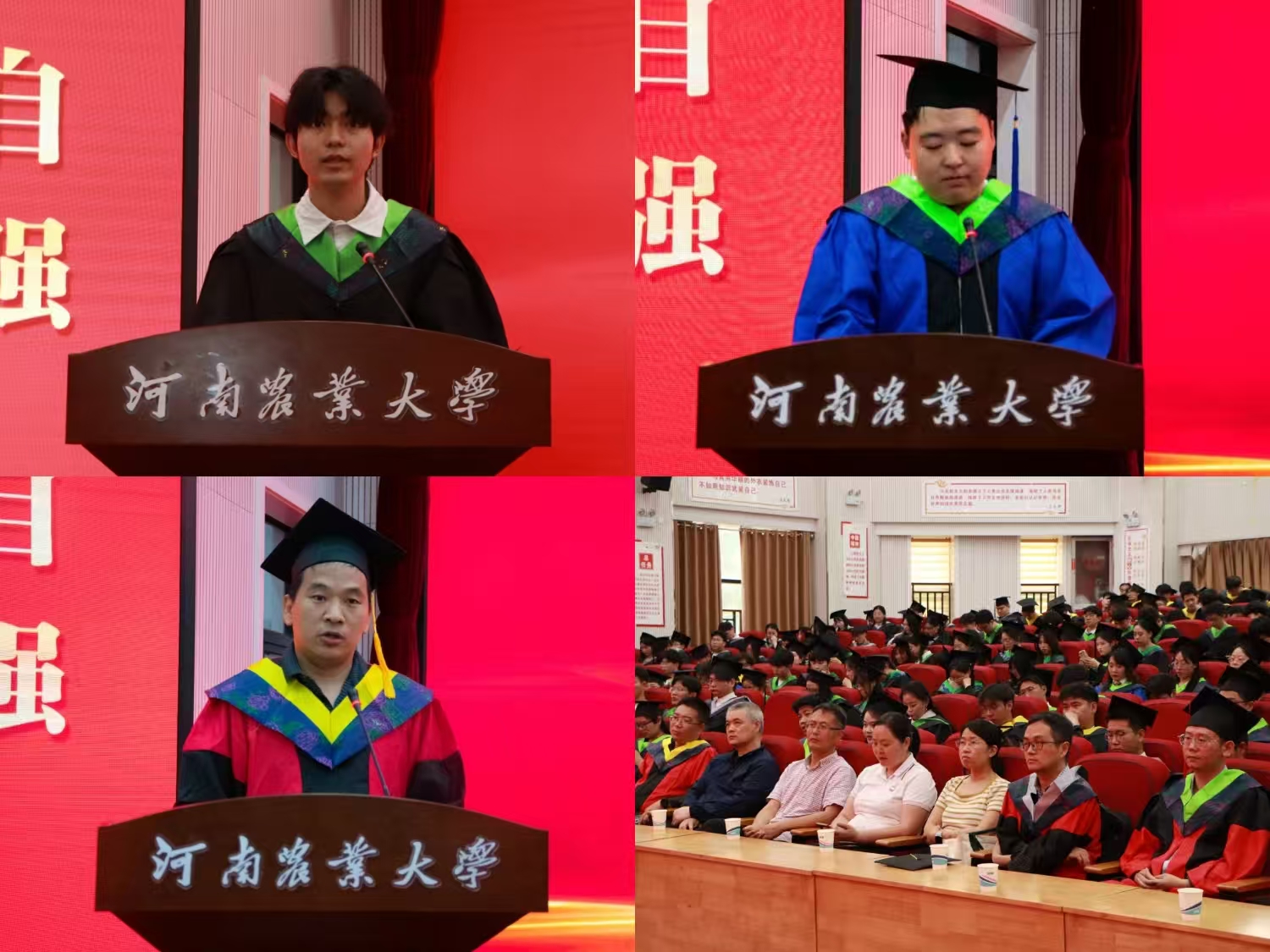 2021级经济林专业练宇作为本科生毕业生代表发言,他深情回顾校园时光,他谈到从初入校园的青涩到如今的自信从容,每一步成长都离不开老师们的谆谆教诲和同学们的温暖陪伴,并坚定承诺将运用所学知识回馈社会,勇担时代赋予的责任,努力成为栋梁之材。2021级林学专业豆浩作为研究生毕业生代表发言,他以自身七年在农大的求学经历为脉络,分享成长故事,诠释了新时代林学人的使命担当,号召全体毕业生坚守绿色使命,在林业领域拼搏奋进,为行业发展贡献力量。最后,教师代表、生态系主任郭二辉老师为毕业生送上殷切期望,他鼓励大家永葆“家国情怀”,将个人发展与国家命运紧密相连;践行“明德自强,求实力行”的校训精神,脚踏实地做事;树立终身学习理念,不断提升自我;以乐观豁达的心态面对未来的挑战。同时表示学院永远是毕业生坚实的后盾,无论何时都欢迎同学们常回家看看。