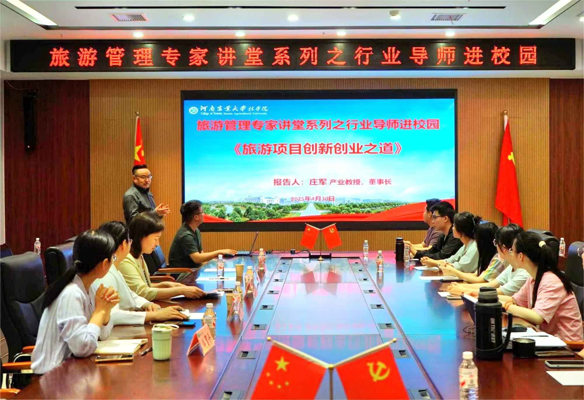 庄军以“旅游项目创新创业之道”为主题,围绕“从资源到体验的创意逻辑”“跨界融合与文旅场景再造”“在地资源的活化手法”“高职高专旅游实践创新路径”“项目风险管控与落地评估”等方面展开系统讲解。通过“只有河南·戏剧幻城”“莫干山民宿经济”“圆明园VR复原”“楚文化+沉浸式体验”等真实案例,深入剖析了新时代旅游业态创新的热点趋势与方法路径,展示了技术、文化与旅游深度融合的生动图景。庄军强调,旅游项目的创意策划不仅需要文化洞察与空间理解,更需创新思维与商业逻辑的支撑。他鼓励同学们将所学知识积极转化为实践能力,探索旅游与乡村振兴、数字科技、非遗文化等领域的交叉创新,勇于创业,敢于突破。