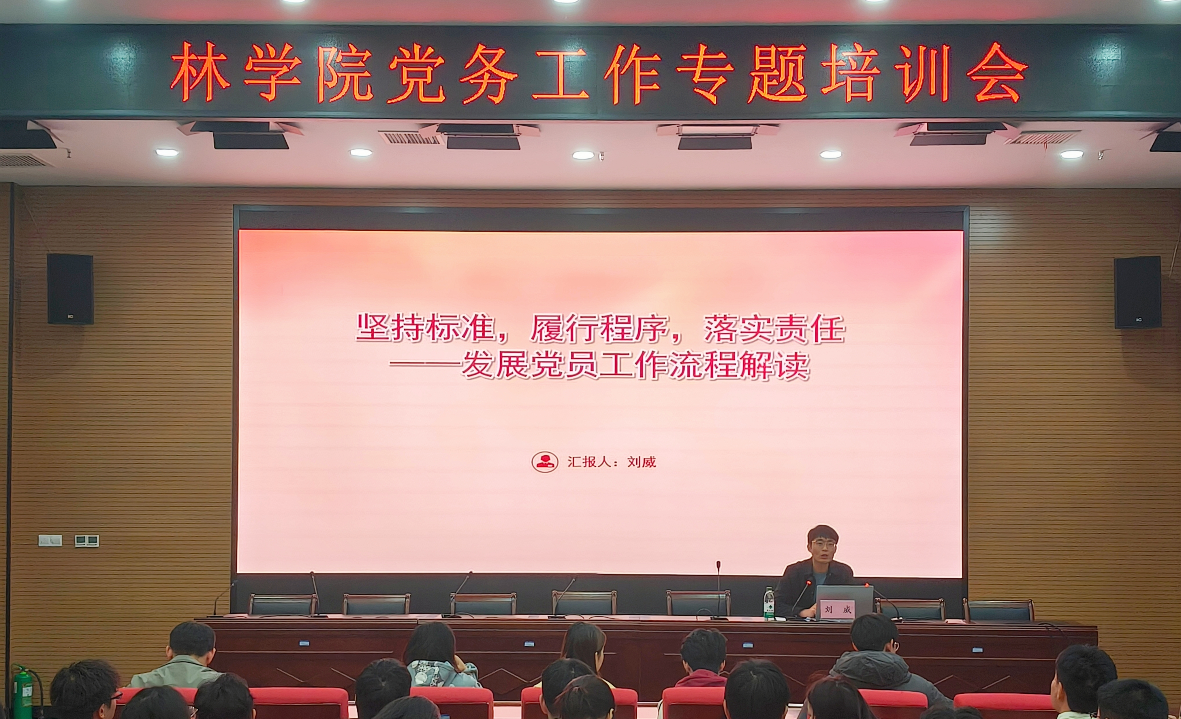 刘威以“坚持标准,履行程序,落实责任”为主题,围绕《中国共产党发展党员工作流程图》、《关于实行“双推双评三全程”进一步规范发展党员工作的意见》和《关于进一步做好在大学生中发展党员工作的通知》三个方面展开报告,全面具体地介绍了入党的流程和各项要求。他强调,党务工作者要认真履行自己的职责,在大学生群体中发展党员要注重结合大学生的特点,引导青年学子积极向党组织靠拢,将优秀的大学生吸收到党员队伍中来。