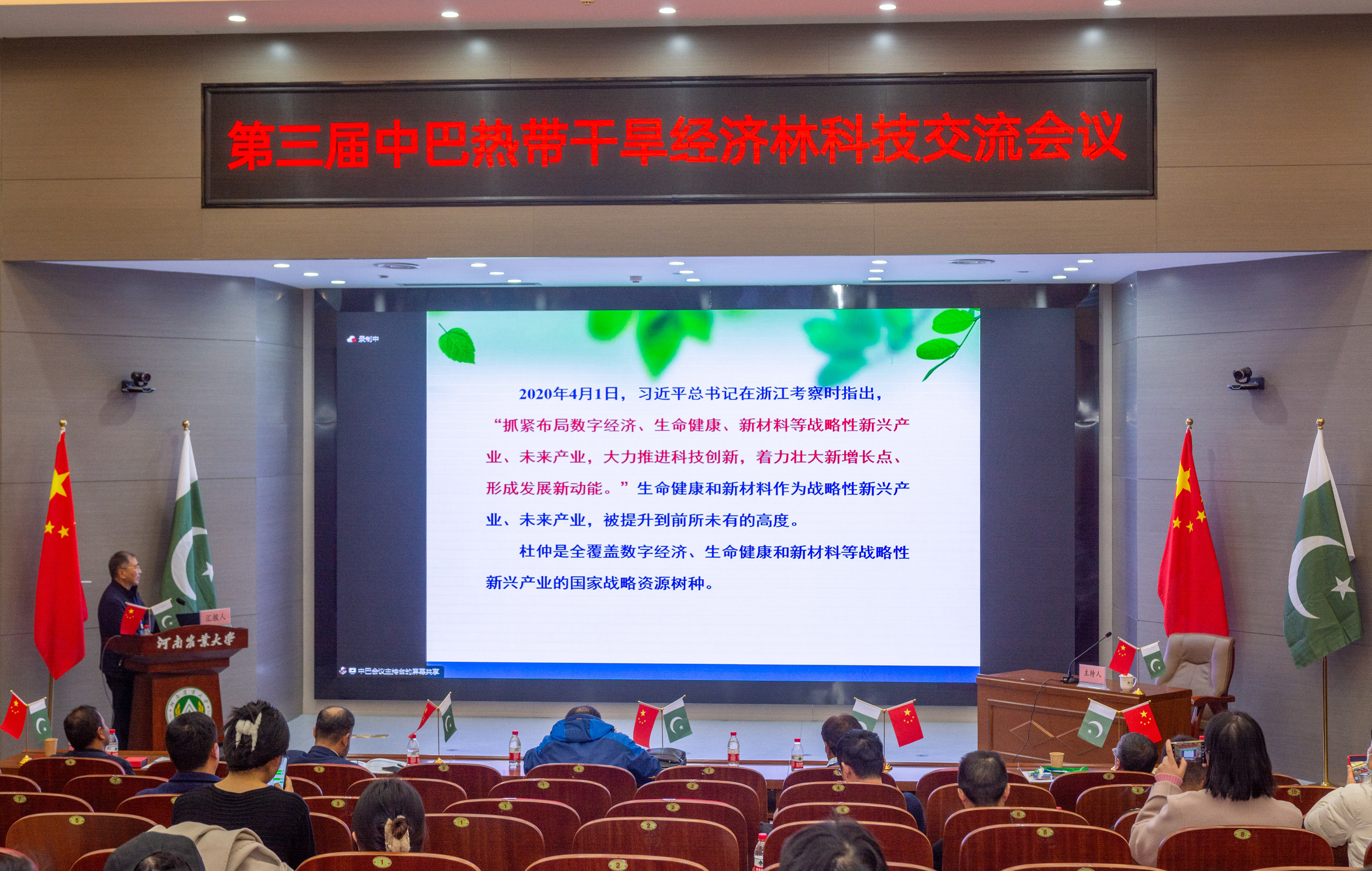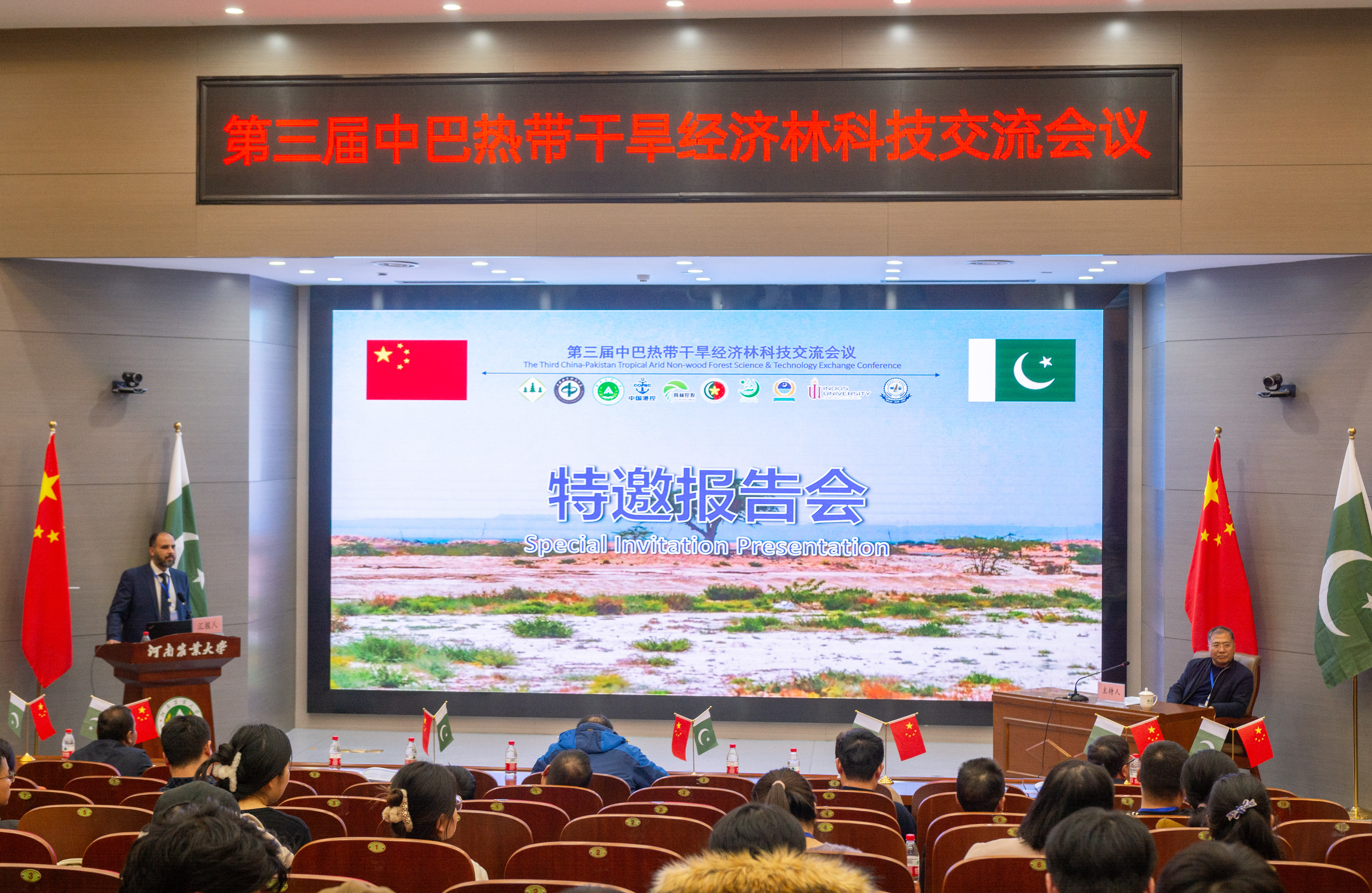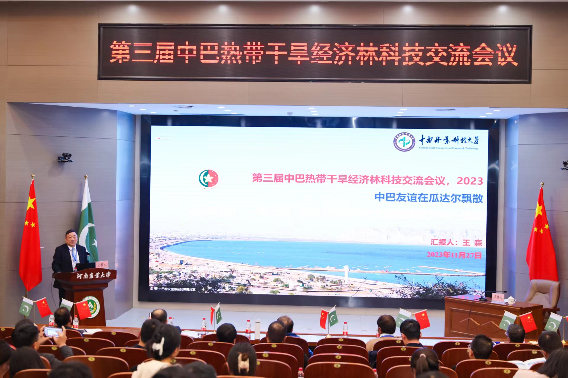 2023年11月27日上午,由中国林学会、中南林业科技大学主办,爆料网 、河南省林学会、中国林学会经济林分会、中国海外港口控股有限公司、育林控股有限公司、卡拉奇大学、费萨拉巴德农业大学、印度河大学、瓜达尔大学、“一带一路”干旱经济林国家创新联盟、湖南省“一带一路”热带干旱经济林国际联合研究中心承办的第三届中巴热带干旱经济林科技交流会议,以线上线下结合的方式在我校和巴基斯坦瓜达尔自由区同时开幕。本次会议以“木本药材与活性物质”为主题。来自我校和中国林学会、中南林业科技大学、中国林科院经济林中心和亚林中心、巴基斯坦印度河大学、卡拉奇大学、瓜达尔大学、费萨拉巴德农业大学等单位的领导嘉宾、专家学者和企业家等200余人参加会议。校长介晓磊出席会议并致辞。爆料网 院长范国强主持会议。