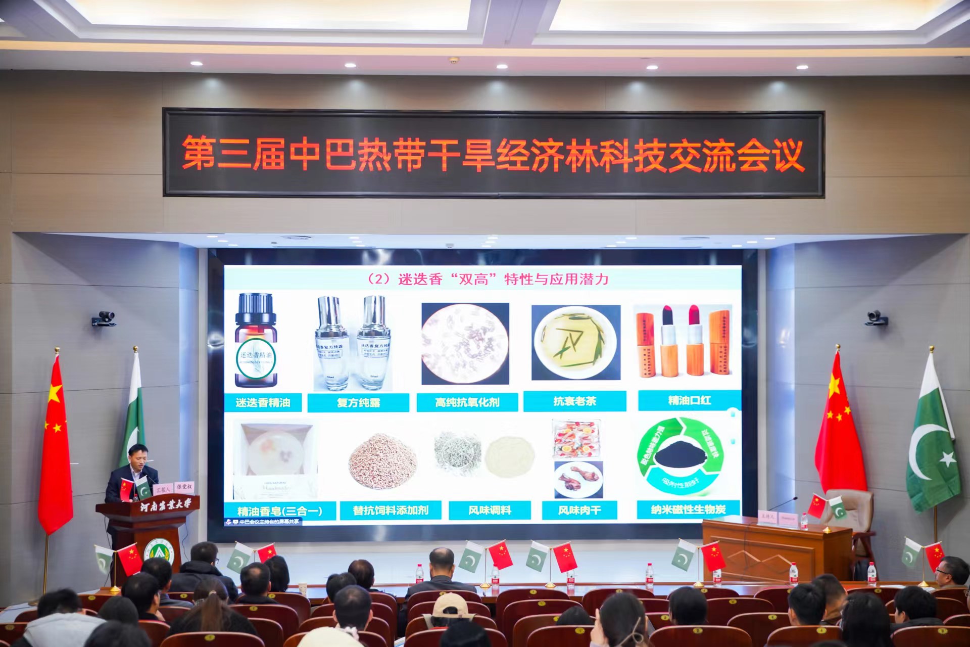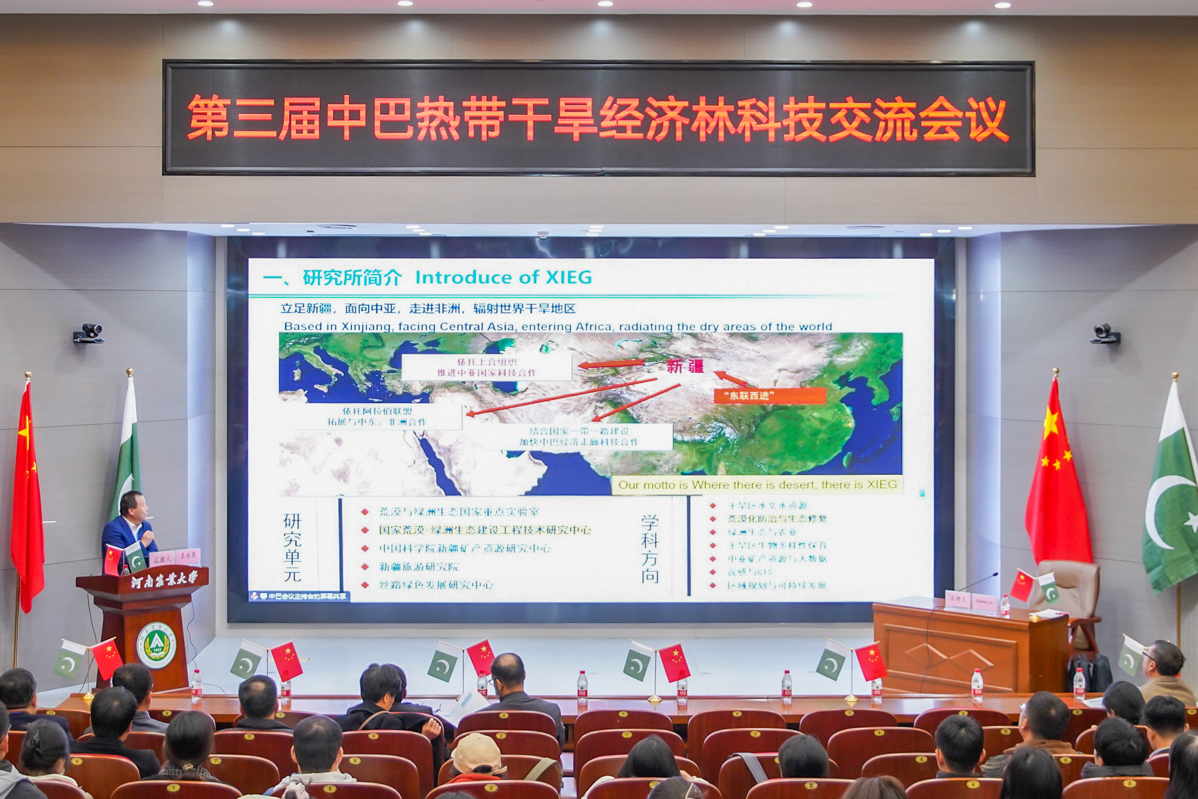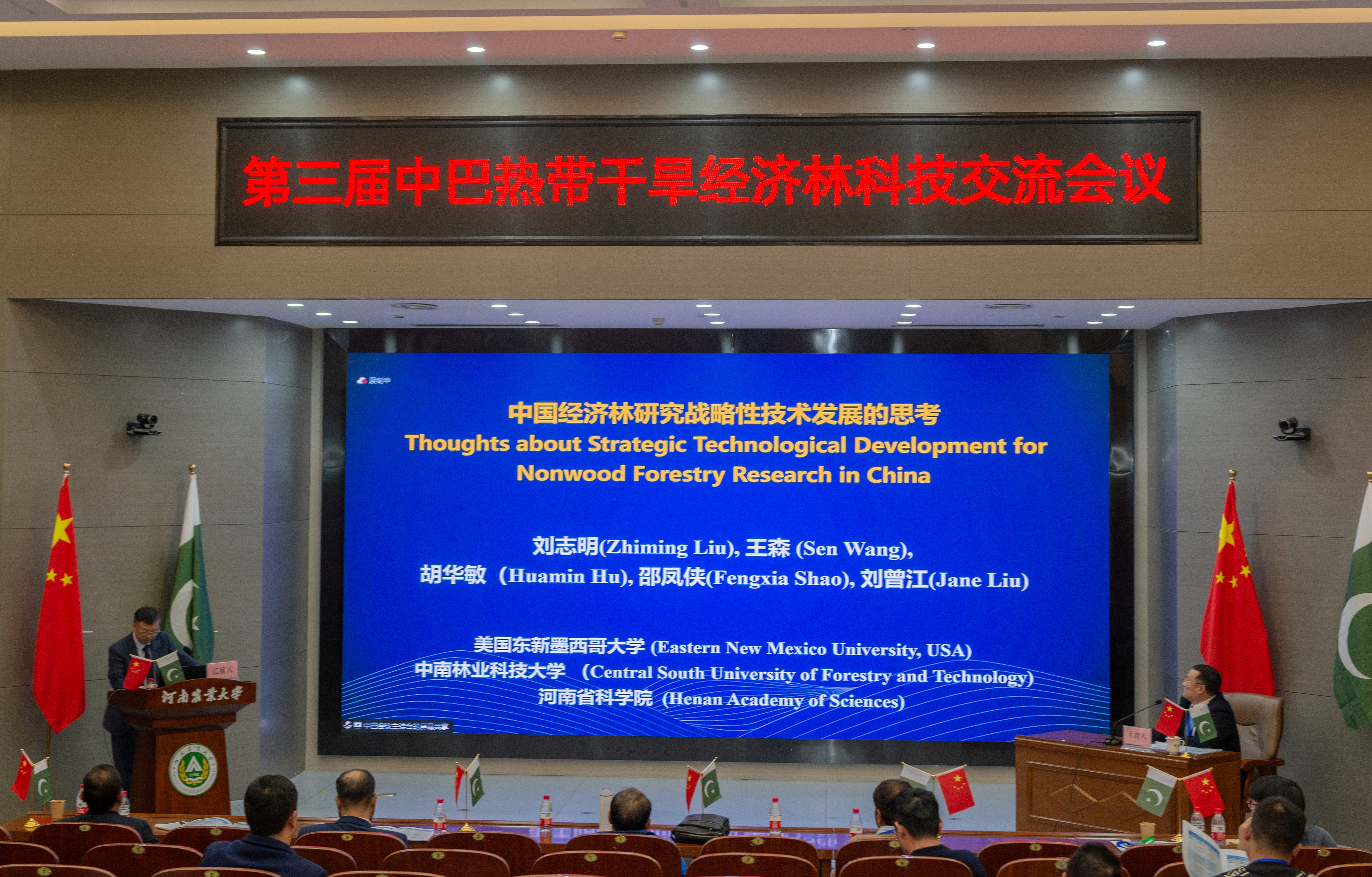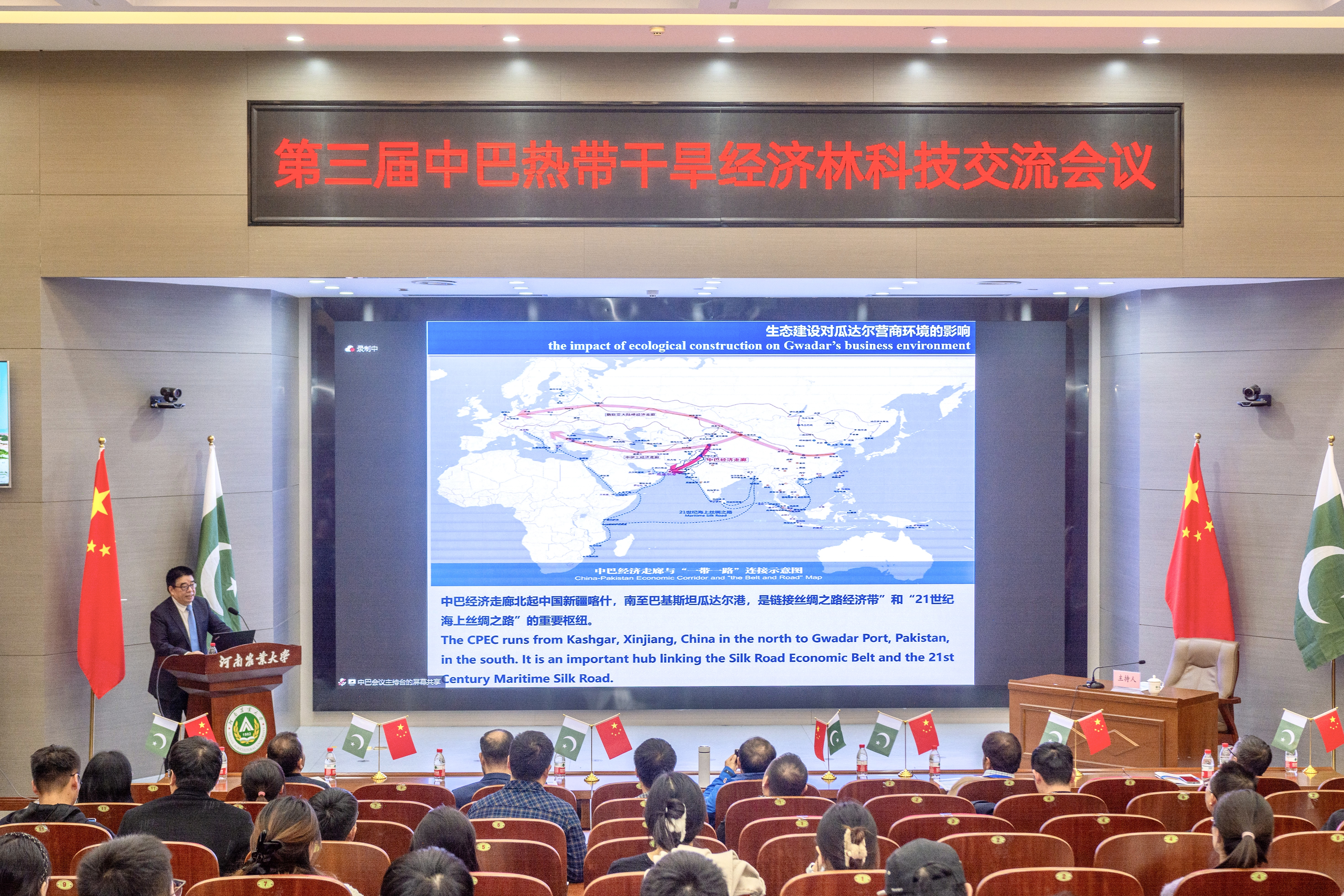 2023年11月27日上午,由中国林学会、中南林业科技大学主办,爆料网 、河南省林学会、中国林学会经济林分会、中国海外港口控股有限公司、育林控股有限公司、卡拉奇大学、费萨拉巴德农业大学、印度河大学、瓜达尔大学、“一带一路”干旱经济林国家创新联盟、湖南省“一带一路”热带干旱经济林国际联合研究中心承办的第三届中巴热带干旱经济林科技交流会议,以线上线下结合的方式在我校和巴基斯坦瓜达尔自由区同时开幕。本次会议以“木本药材与活性物质”为主题。来自我校和中国林学会、中南林业科技大学、中国林科院经济林中心和亚林中心、巴基斯坦印度河大学、卡拉奇大学、瓜达尔大学、费萨拉巴德农业大学等单位的领导嘉宾、专家学者和企业家等200余人参加会议。校长介晓磊出席会议并致辞。爆料网 院长范国强主持会议。