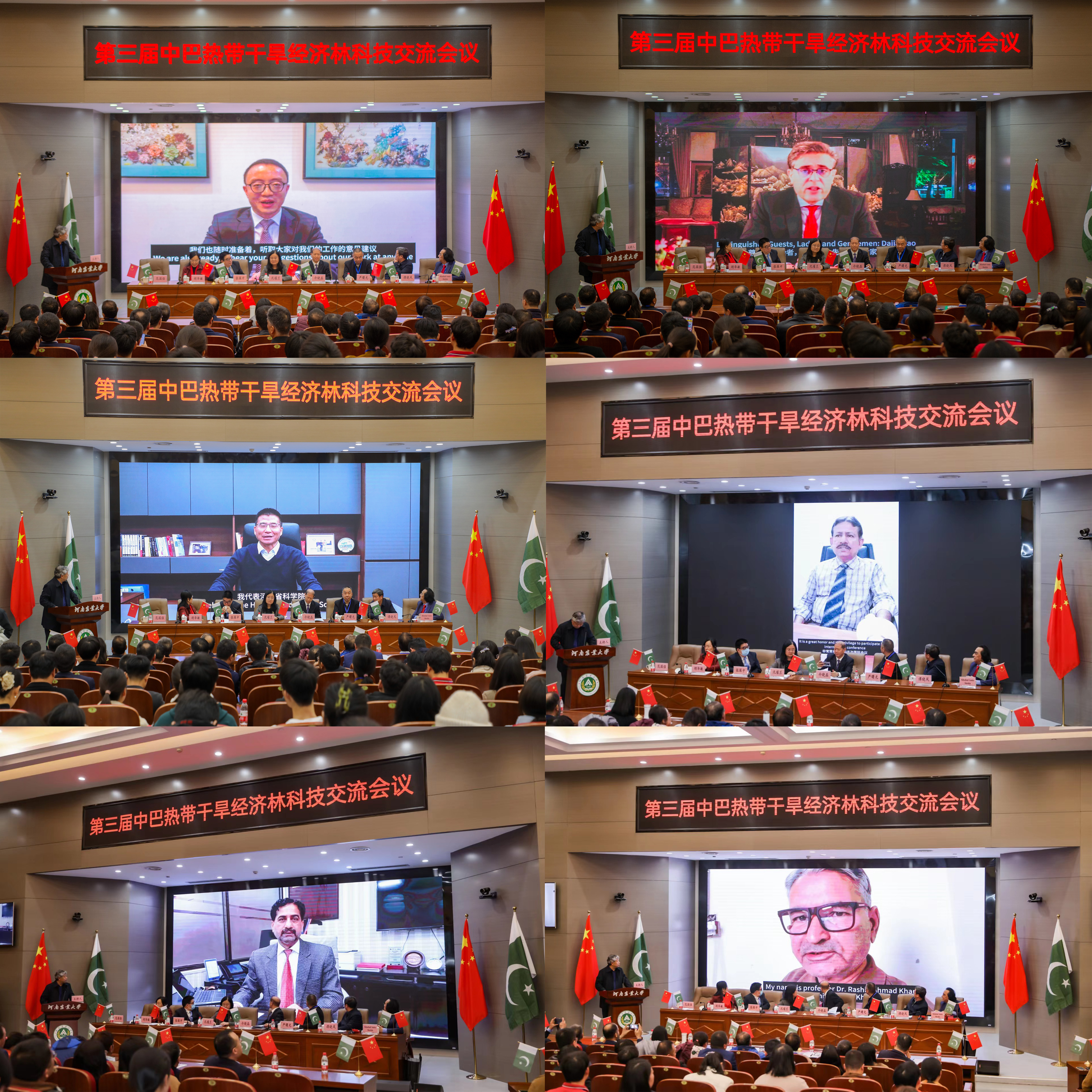 中华人民共和国驻卡拉奇总领事馆杨广元参赞,巴基斯坦伊斯兰共和国驻华大使馆哈什米大使线上致辞,中国科学院院士、河南省科学院院长徐红星院士,育林控股有限公司董事长胡华敏教授,中国林学会经济林分会谭晓风理事长,巴基斯坦卡拉奇大学校长穆罕穆德·法希姆·西迪基教授,费萨拉巴德农业大学校长贾法尔·贾斯卡尼教授,费萨拉巴德农业大学拉希德·瓦西姆·汗教授,印度河大学校长阿民教授等为大会纷纷致辞,对会议的顺利召开表示祝贺,为中巴两国在科技攻关、人才培养和产学研合作等方面提出建议和希望。