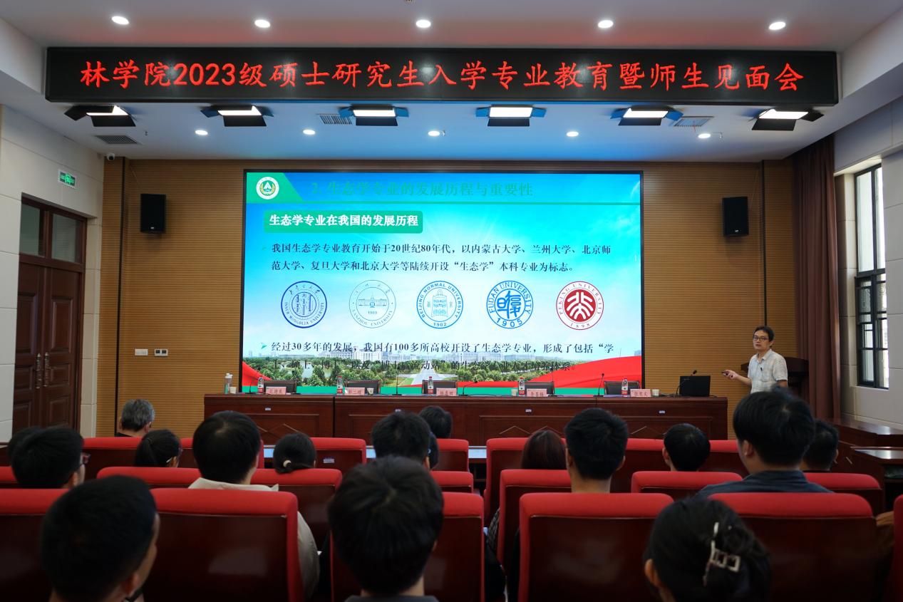会议分为林学和林业、生态学、旅游管理三个专场,依序进行。会上,副院长李喜梅首先代表学院热烈欢迎同学们的到来,并介绍了学院、学科和研究生教育情况,希望同学们树立远大志向,坚定理想信念,拿出强国必定有我的担当,尽快进入学习状态;并叮嘱同学们要遵守学校的各项规章制度,严守学术道德规范。