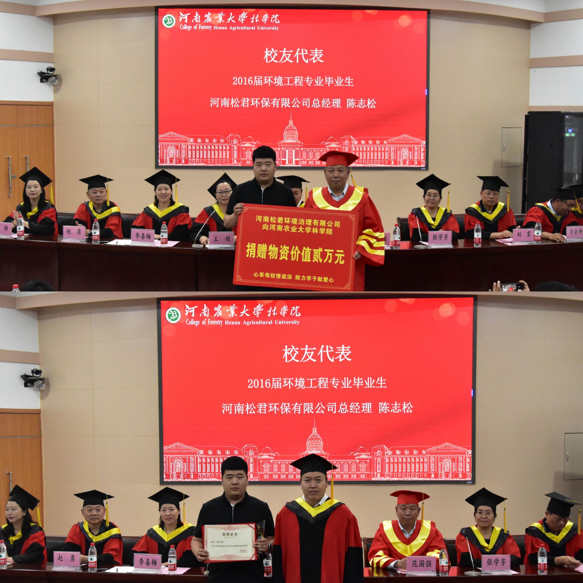 随后举行校友捐赠仪式,优秀校友、河南松君环境治理有限公司总经理陈志松向学院捐赠毕业生物资两万元,院党委书记化青报向校友陈志松颁发“大学生创新创业标兵”证书及奖杯。