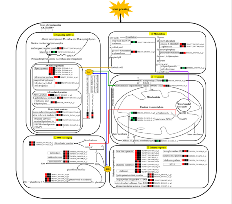进一步通过蛋白质组学数据,系统比较分析了切根诱导侧柏根系的蛋白质表达差异,解析了可能参与侧柏根系响应切根伤害过程中介导生长-防御权衡的关键蛋白(图2),为利用分子育种手段丰富健壮苗木培育理论和植被恢复技术体系提供了理论基础。