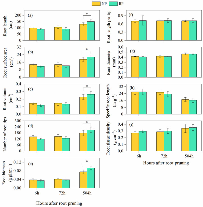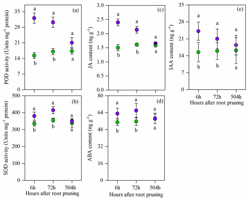 研究发现,切根后侧柏根系生长(根长、根表面积、根体积和根尖数)和生理特征(植物激素:IAA、ABA和JA;抗氧化酶:POD和SOD)对切根的响应在时间上是不同步的,具体表现为:根系生长在切根后期(504 h)明显增加(图1),而其生理性状却在切根前期(6 h 和72 h)反应更敏感(图1)。有趣的是,与不切根相比,切根72 h侧柏根系上新根生长点显著增多,表明植物激素IAA在此阶段可能刺激了侧根的形成,最终促进了根系生长,可能IAA通过与多种植物激素和其它信号(例如ROS)交互作用来调节切根后侧柏根系生长-防御间的权衡。