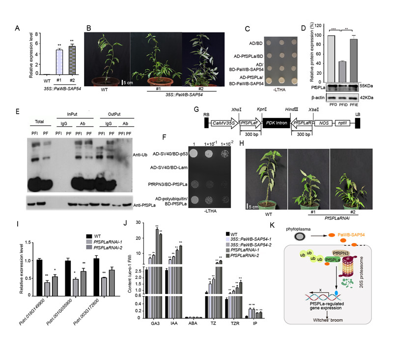 利用HGAP软件和三代PacBio测序平台构建了泡桐丛枝植原体基因组完成图。丛枝植原体核基因组大小为891,641 bp,有1,147 个开放阅读框、32个tRNAs和4个可移动元件,丛枝植原体含有73个效应因子,其中11个效应因子可能与丛枝病的发生密切相关。过表达PaWB-SAP54能增加毛果杨幼苗分枝数量。泡桐丛枝植原体与洋葱黄花植原体进化关系最近。酵母双杂交、双分子荧光互补和免疫共沉淀结果表明,效应子PaWB-SAP54可经26S蛋白酶体途径发生泛素化从而诱导丛枝的产生;同时,沉默PfSPLa也能引起毛果杨分枝表型的发生;转基因植株中赤霉素、生长素和细胞分裂素含量有显著变化(图3)。该结果为进一步阐明泡桐丛枝病发生分子机制奠定了坚实基础。
