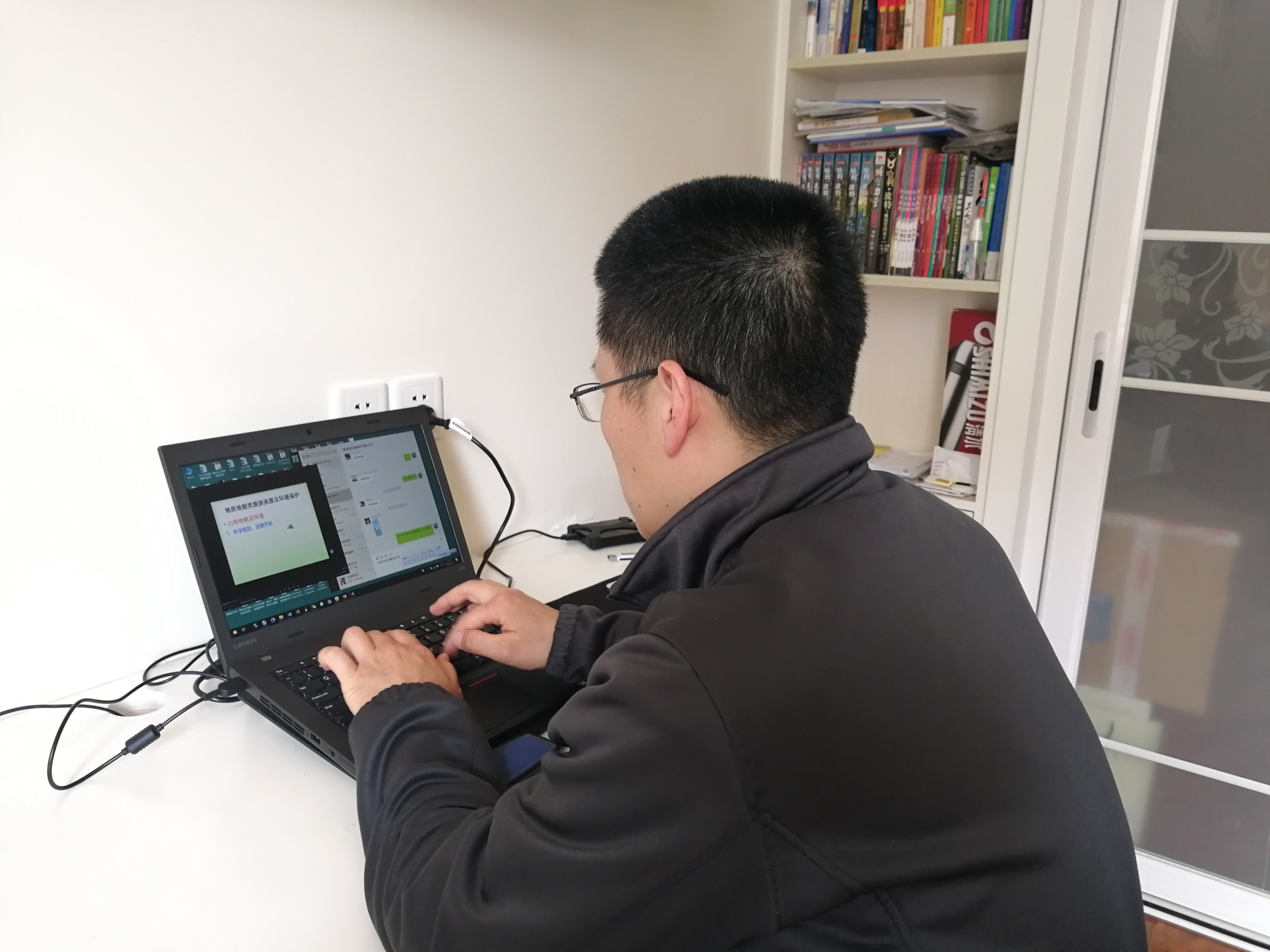 桑玉强老师对《旅游环境保护》这门课早已烂熟于心,但网络授课却是第一次。他暗暗下决心,绝不能因为网络授课而影响教学进度和质量。开学前两周他就开始着手准备建课、录视频、补充资料等工作。原以为课程录制很轻松,殊不知看着容易做着难。比如录制视频过程中出现的停顿、口误、口语及各知识点之间的过渡等,有时为了一个知识点讲解的更透彻要反复录制。网络课程构架、课程录制等完成后,就是网络上课预案准备工作。考虑到全国高校都要借助网络开展在线教学,网速定会受影响,桑老师便把教学资料传至课堂派空间,以备不时之需。同时,组建企业微信群,让所有选课学生加入,做应急备案之用。
