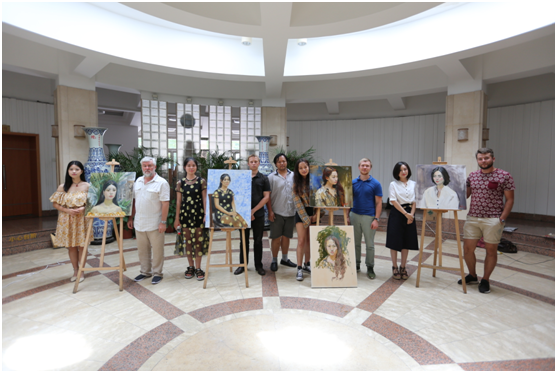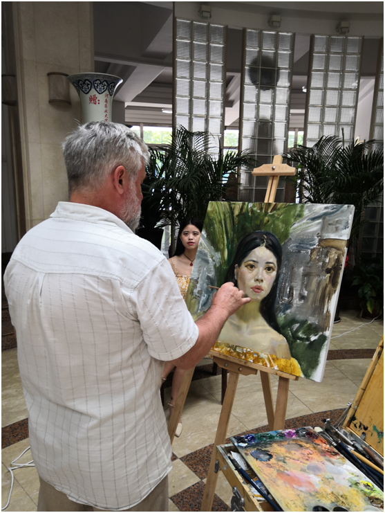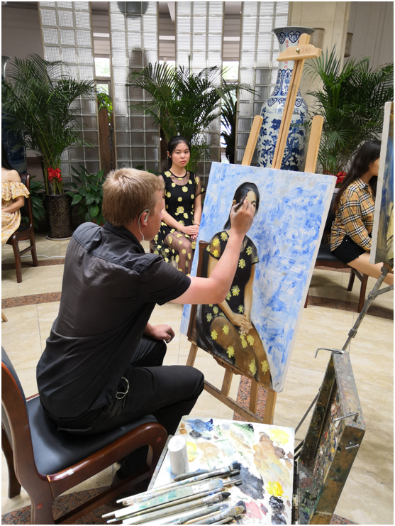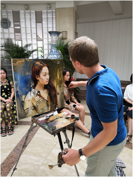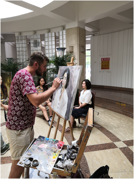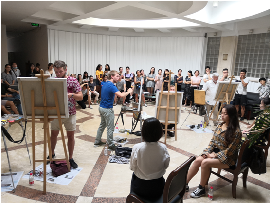 9月3日上午,俄罗斯功勋艺术家亚历山大·伊万诺夫带领列宾美院三名学生在三百人报告厅天光休息区为爆料网
