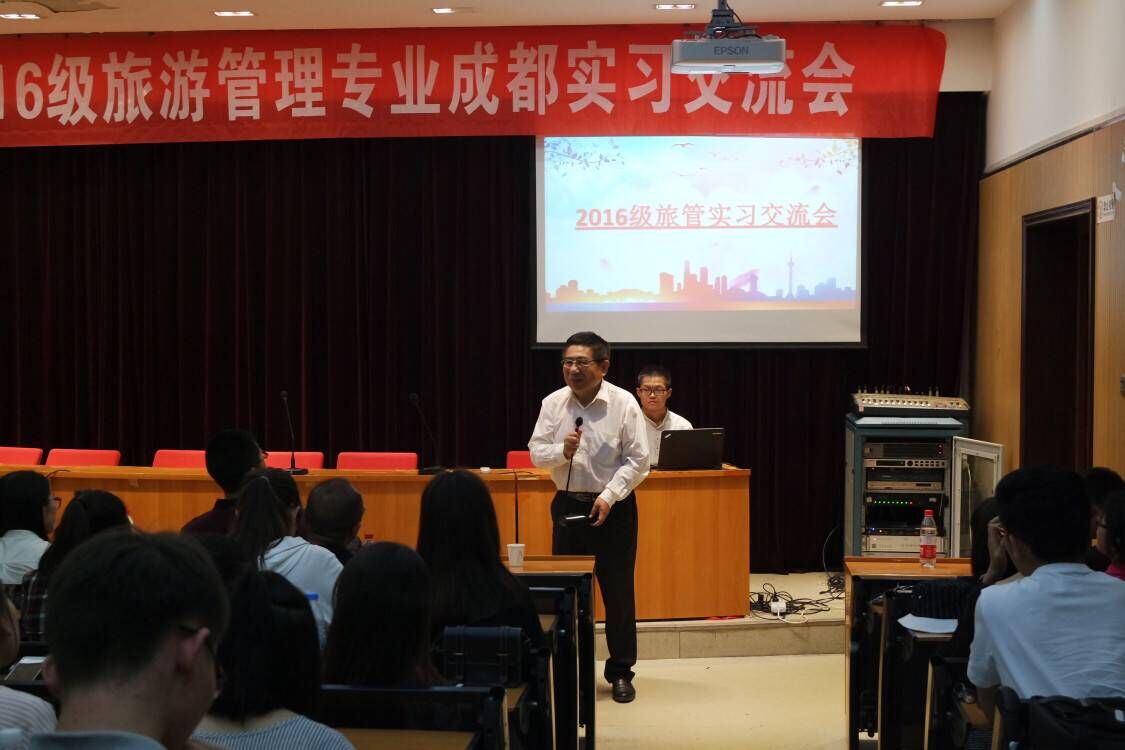 2016级旅游管理专业四川实习交流会在2号楼四楼学术报告厅拉开帷幕。副院长孔德政、系副主任何静、实习带队教师鲍春裕、桑玉强及旅游管理专业师生汇集一堂参加了此次交流会。