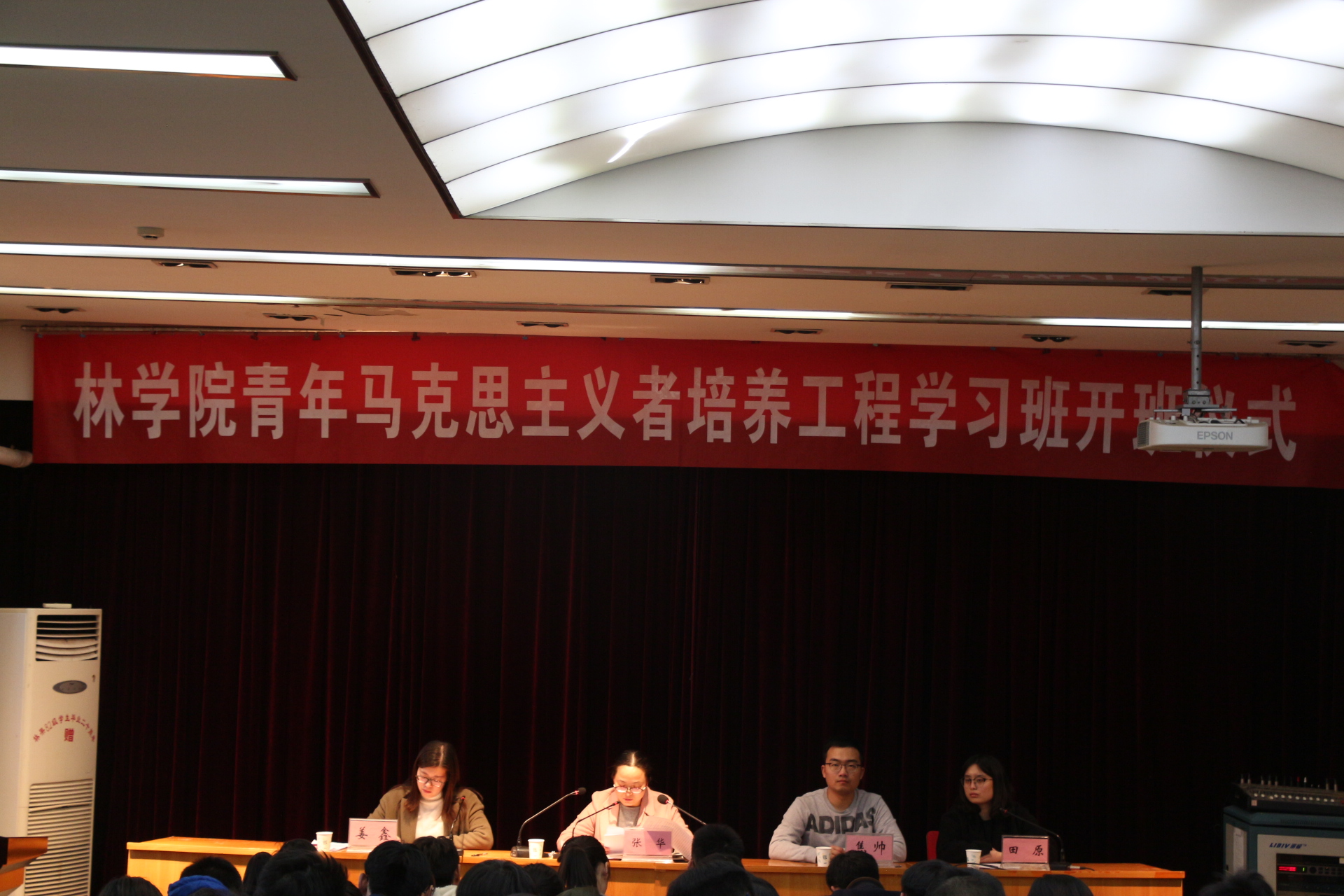 于二号楼四楼学术报告厅召开开班仪式,院党委副书记张华、院党委组织员焦帅、院团委副书记姜鑫,辅导员田原出席了此次仪式,全体青马班成员参加了本次仪式。仪式由姜鑫主持。