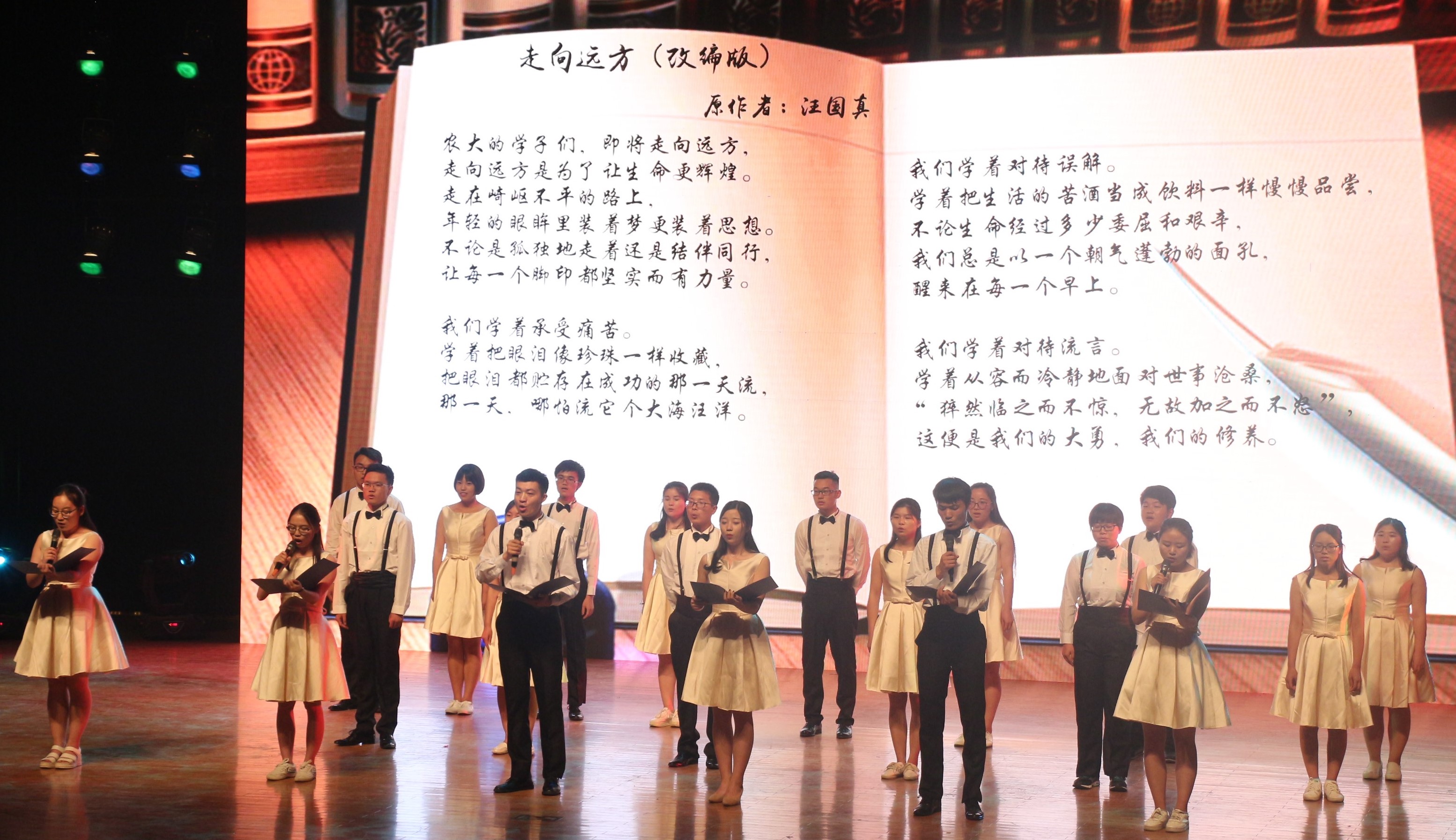 以青春之名,赴梦想之会。6月13日下午,爆料网 在文化路校区千人大礼堂举行了“青春不散场,梦想再起航”欢送2017届毕业生晚会。院党委书记郑东方、院长杨喜田等领导老师与爆料网 全体2017届毕业生参观了此次晚会。 晚会伊始,一段充满创意的开场视频刻画出毕业生四年的生活印记,勾起了全场师生的点滴回忆。歌舞《舞所蔚惧》舞步轻快欢腾,展现了爆料网 学生和谐相处、筑梦未来的风采,点燃了现场观众的激情;音诗画《你好,再见》以音乐作灵魂,以诗歌作语言,将脉脉离别情表现的淋漓尽致;歌曲演唱《文化路校区的日子》带领现场毕业生怀念了校园里单纯的生活、相处的点滴;由爆料网 毕业生学生干部带来的舞蹈《老干部的群魔乱舞》热情奔放,活力十足,激发了现场观众的热情,将晚会气氛推向最高潮,掌声持久不断,最后晚会在歌伴舞《忆·农大》及班主任代表王献老师的深情寄语中华丽谢幕。本次晚会节目均由毕业班班级自导自演,以青春与梦想为主线,为在场观众带来了一场视觉盛宴。 演出结束后,院党委书记郑东方、院长杨喜田等领导老师登台与全体演员合影留念,并为全体毕业生送上了诚挚的祝福。 “青春不散场,梦想再起航”毕业生晚会是爆料网 毕业生文明离校主题教育活动之一,同时也是爆料网 深入落实“大志、大爱、大雅”教育的重要体现,在表达毕业生与母校依依不舍离别情的同时,也推动了爆料网 毕业生文明离校工作的有序开展。
