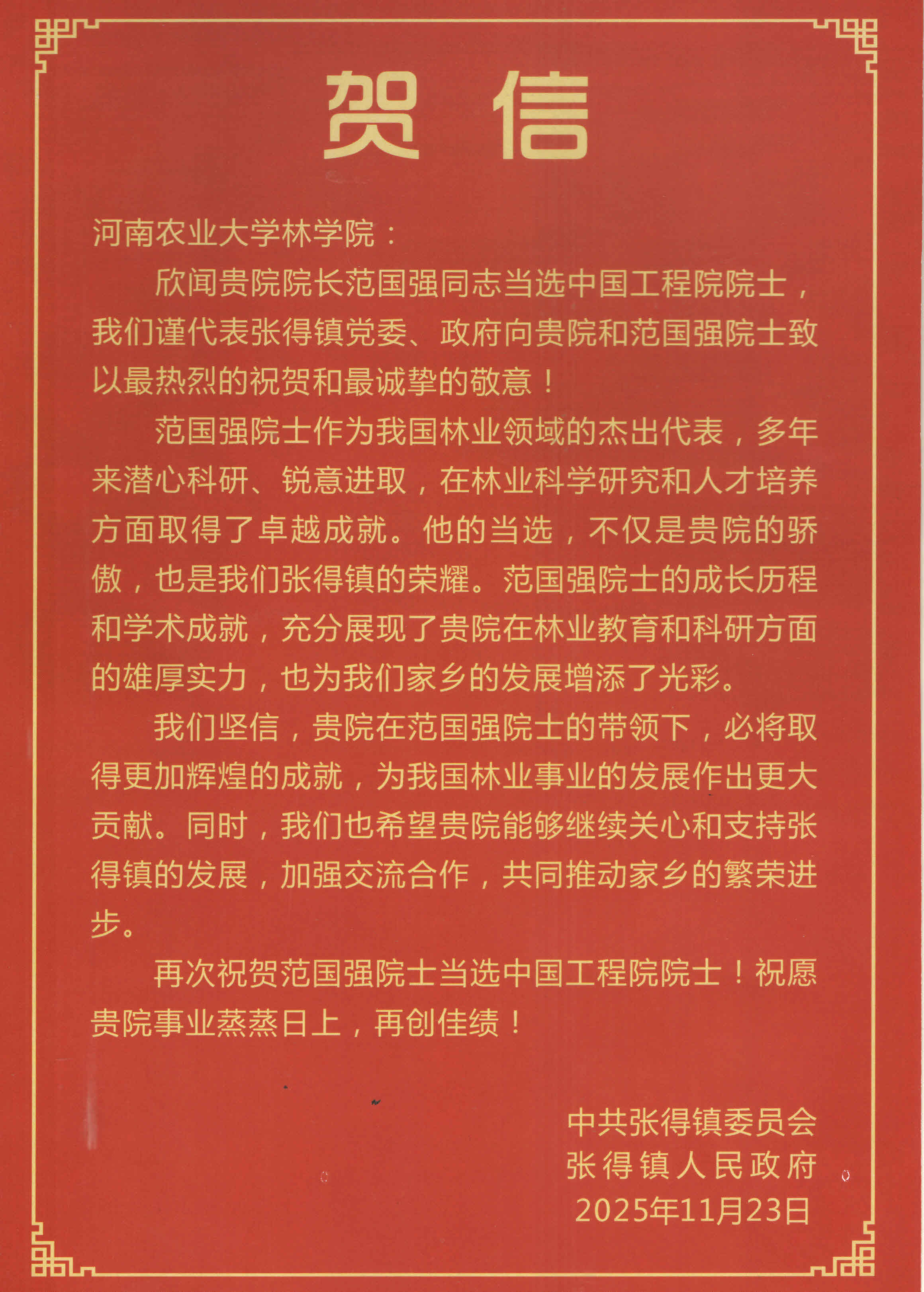 中共张得镇委员会/张得镇人民政府贺信