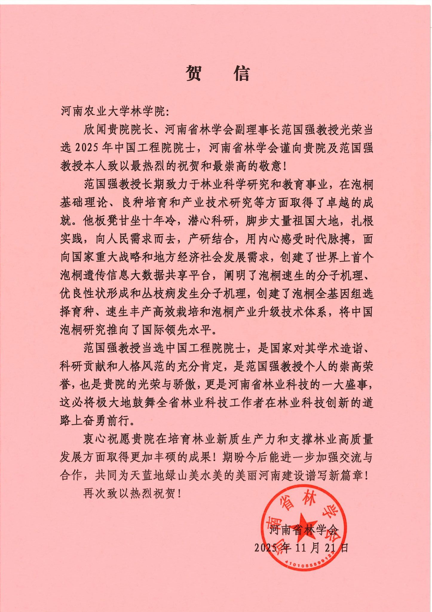 河南省林学会贺信