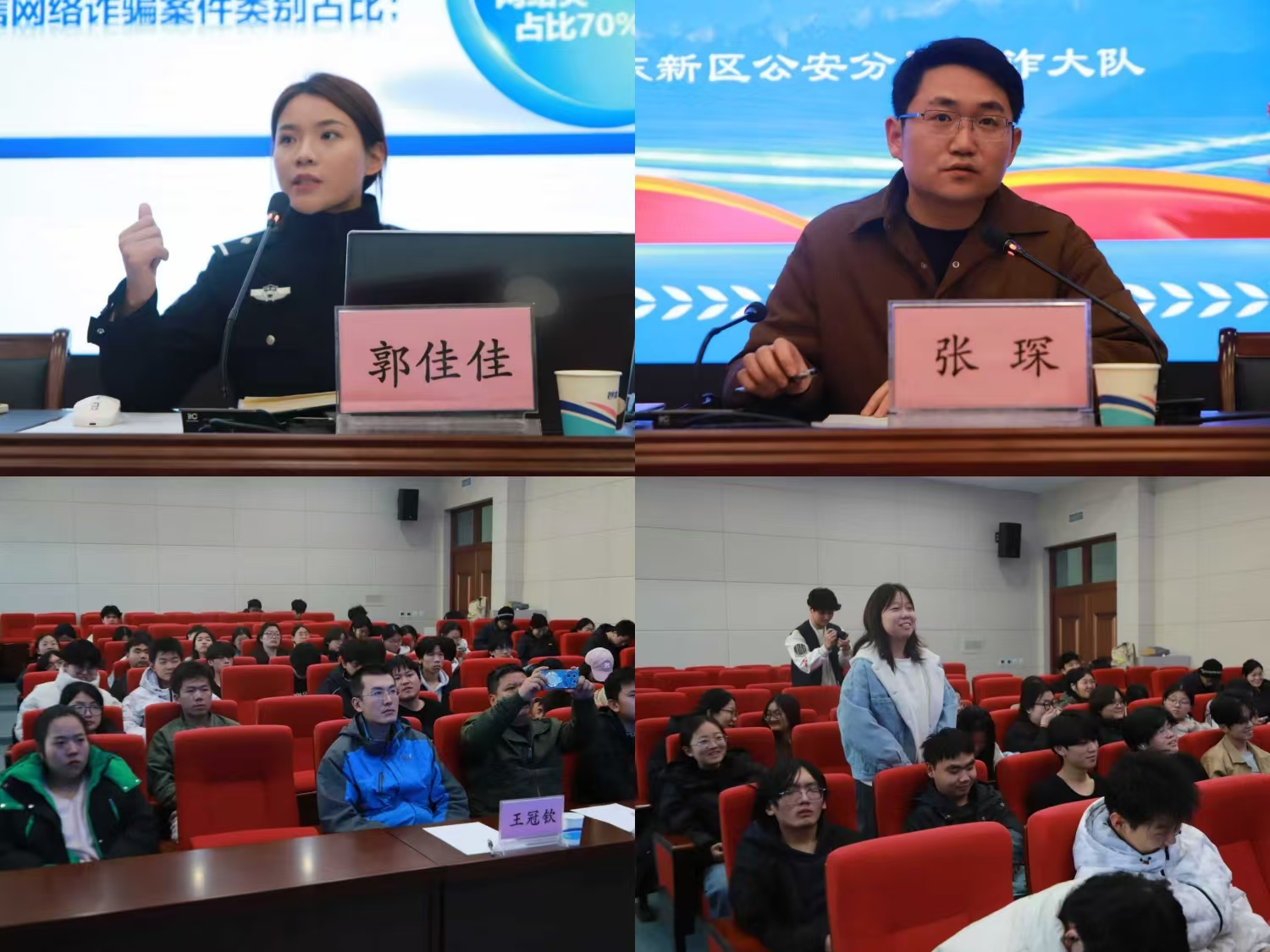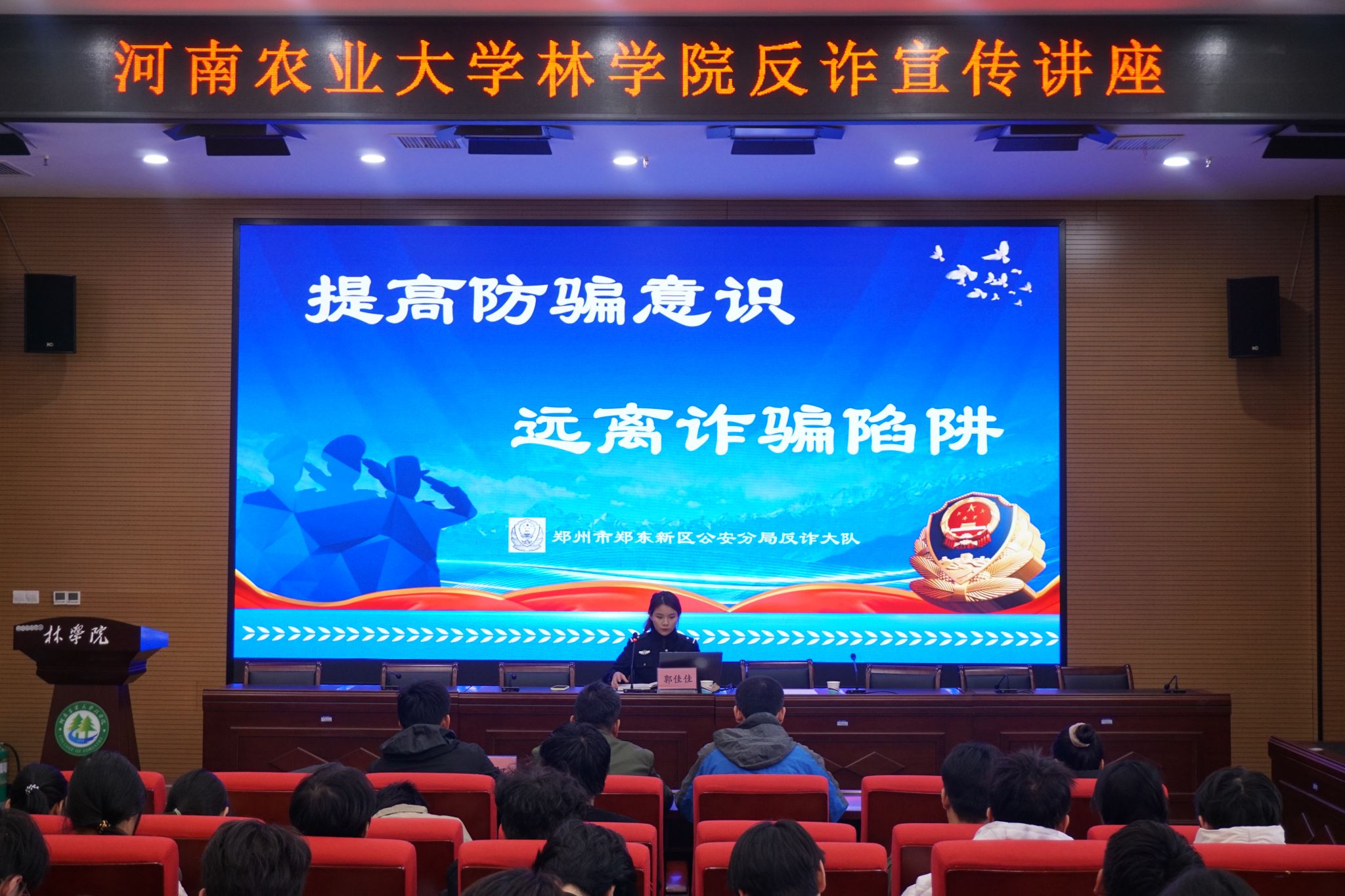 于龙子湖校区力行楼南428报告厅开展主题反诈宣传讲座。本次活动荣邀到郑东新区反诈大队宣传讲师郭佳佳警官担任主讲人。龙子湖办事处薛何、校保卫处吴旭辉、院团委老师王冠钦参加讲座。本次活动由院团委老师张琛主持。