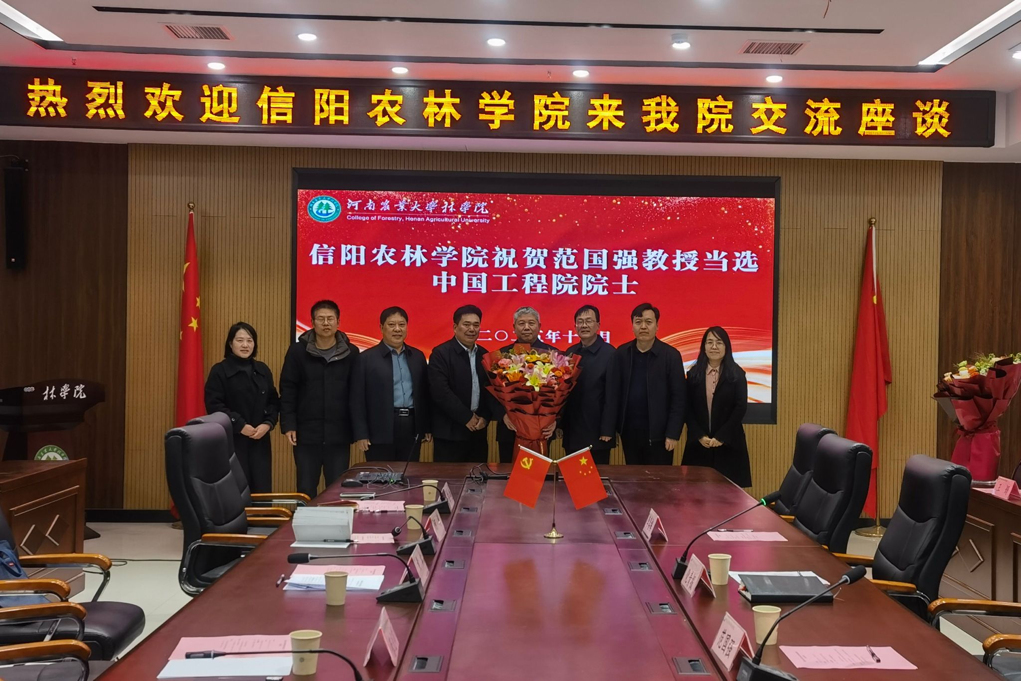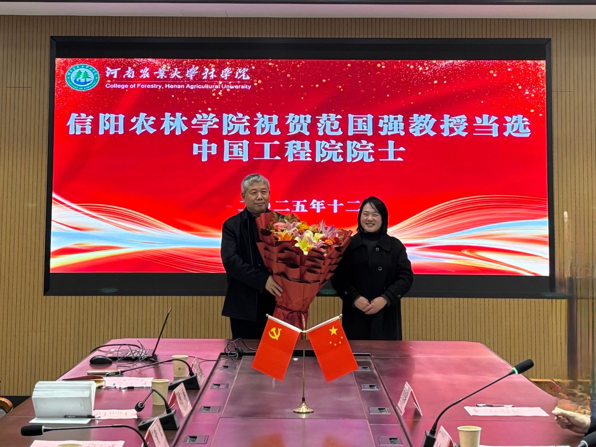 ,向新当选院士的范国强教授敬献鲜花表达祝贺。