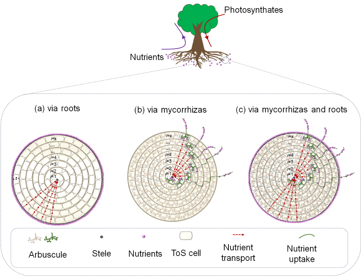 图3. 仅通过根进行养分吸收(a)、仅通过菌根真菌进行养分吸收(b),以及根与菌根真菌同时参与养分吸收(c)的模式图