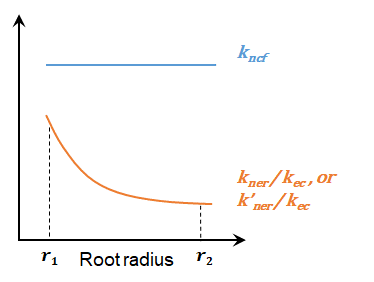 本研究对比非菌根植物和菌根植物根系中碳-养分的双向转移与根解剖结构,尤其是与皮层结构的关系(图3),得出如下结果:单位碳或能量投入下的养分收益(即碳利用效率,kner kec)会随着根直径的增加而下降(图4中橙色曲线),这是因为粗吸收根的皮层更厚(由“根结构异速关系”而知),养分跨该厚皮层的主动运输耗能(碳)较高。菌根真菌的碳利用效率主要取决于根与菌根接触界面(丛枝菌根结构中的丛枝、囊泡;外生菌根中的Hartig net)的碳-养分交换效率(即kncf);对于某一种菌根真菌来说,此交换效率一般不变(图4中蓝色直线)。