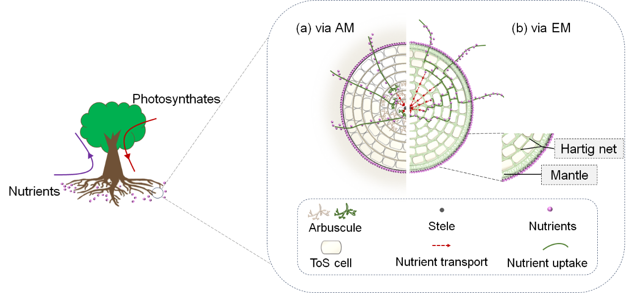 陆地绝大多数植物通过共生的菌根真菌增强养分吸收能力。在此共生体中,菌根真菌给宿主根系提供养分,而根系则将碳(脂类为主)供应给前者。近来人们对根系-菌根真菌这种双向的物质交换关系和分子机制有深入的认识,但“根结构异速关系”这种广泛存在的根系特征,在根-菌共生体内碳-养分交换关系中扮演怎样的角色仍然未知。