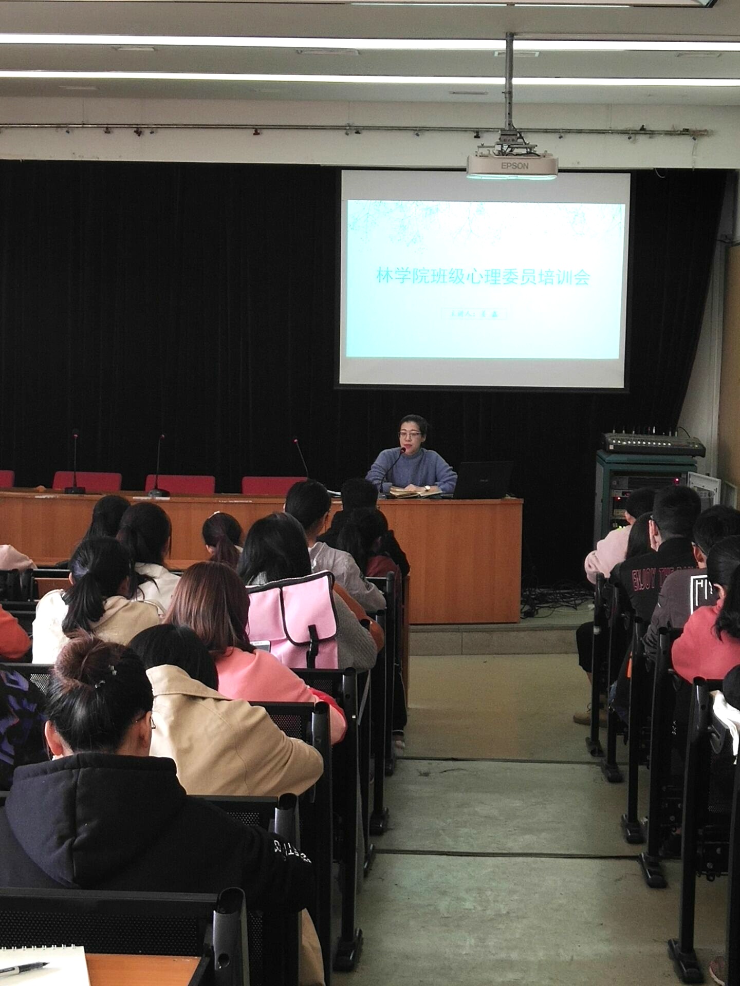 于10月30日在二号楼四楼学术报告厅召开心理委员培训会。院团委副书记姜鑫出席并主持本次培训会,各班心理委员参加聆听。