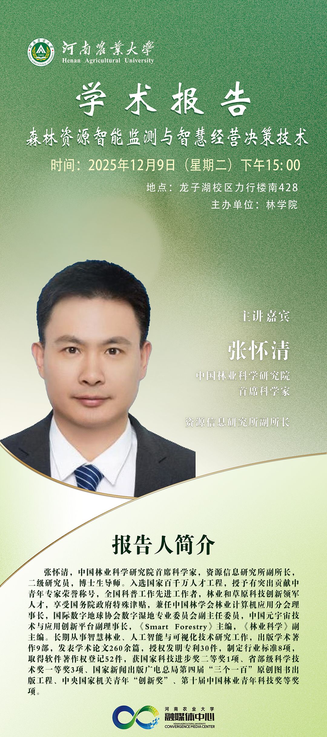 张怀清,中国林业科学研究院首席科学家,资源信息研究所副所长,二级研究员,博士生导师。入选国家百千万人才工程,授予有突出贡献中青年专家荣誉称号,全国科普工作先进工作者,林业和草原科技创新领军人才,享受国务院政府特殊津贴,兼任中国林学会林业计算机应用分会理事长,国际数字地球协会数字湿地专业委员会副主任委员,中国元宇宙技术与应用创新平台副理事长,《Smart Forestry》主编,《林业科学》副主编。长期从事智慧林业、人工智能与可视化技术研究工作,出版学术著作9部,发表学术论文260余篇,授权发明专利30件,制定行业标准8项,取得软件著作权登记52件,获国家科技进步奖二等奖1项、省部级科学技术奖一等奖3项、国家新闻出版广电总局第四届“三个一百”原创图书出版工程、中央国家机关青年“创新奖”、第十届中国林业青年科技奖等奖项。